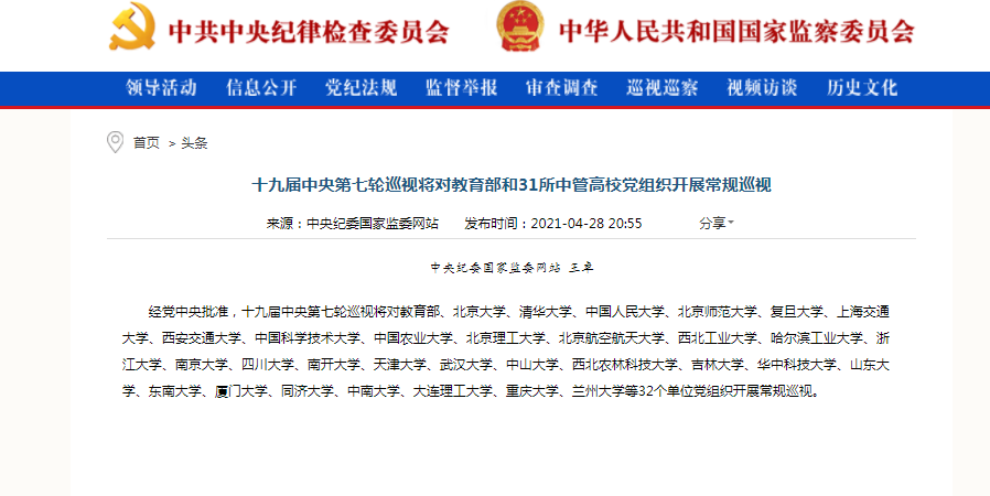 经党中央批准,十九届中央第七轮巡视将对教育部、北京大学、清华大学、中国人民大学、北京师范大学、复旦大学、上海交通大学、西安交通大学、中国科学技术大学、中国农业大学、北京理工大学、北京航空航天大学、西北工业大学、哈尔滨工业大学、浙江大学、南京大学、四川大学、南开大学、天津大学、武汉大学、中山大学、西北农林科技大学、吉林大学、华中科技大学、山东大学、东南大学、厦门大学、同济大学、中南大学、大连理工大学、重庆大学、兰州大学等32个单位党组织开展常规巡视。