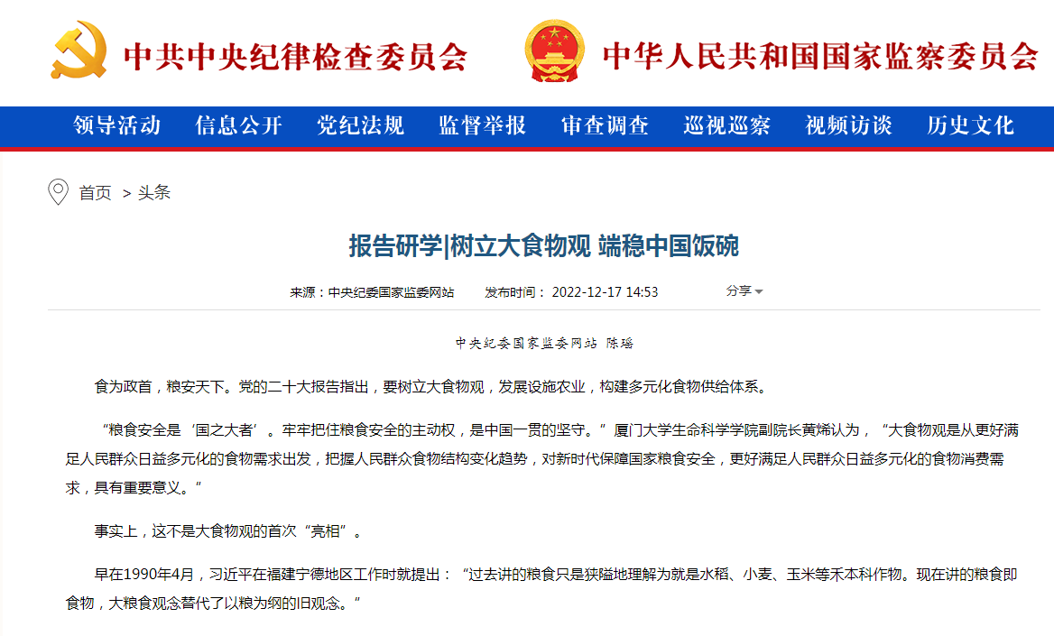 食为政首,粮安天下。党的二十大报告指出,要树立大食物观,发展设施农业,构建多元化食物供给体系。