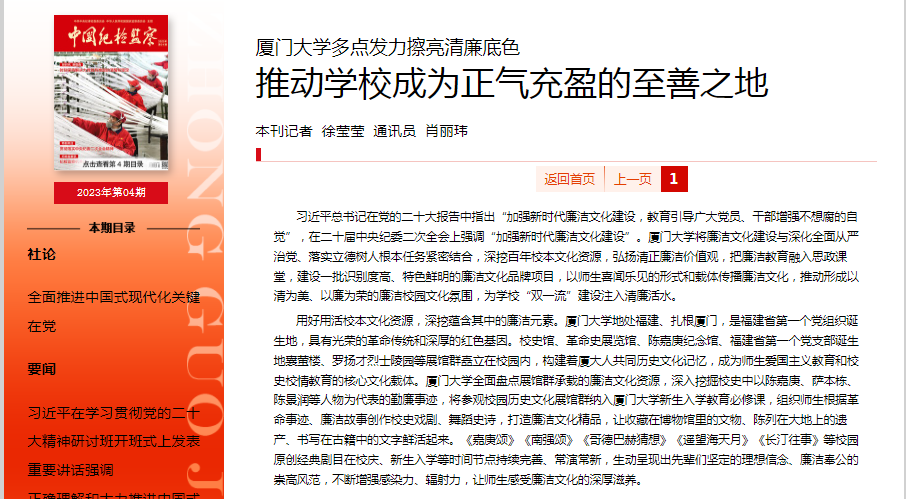 厦门大学纪委有关负责人表示,要认真落实《关于加强新时代廉洁文化建设的意见》,拓展利用廉洁文化资源,丰富廉洁文化优质产品和服务供给,以系统观念持续推进建设富有时代特征、厦大特色的校园廉洁文化,厚植廉洁治校、廉洁从教、廉洁育人、廉洁修身的文化土壤和崇尚廉洁、鄙弃贪腐的校园风尚,推动学校成为崇德重道、纪法严明、良师涌现、正气充盈的至善之地。