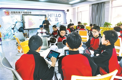 辽宁省沈阳市博才初级中学学生在智慧课堂上进行英语听说学习。 图片来源:视觉中国