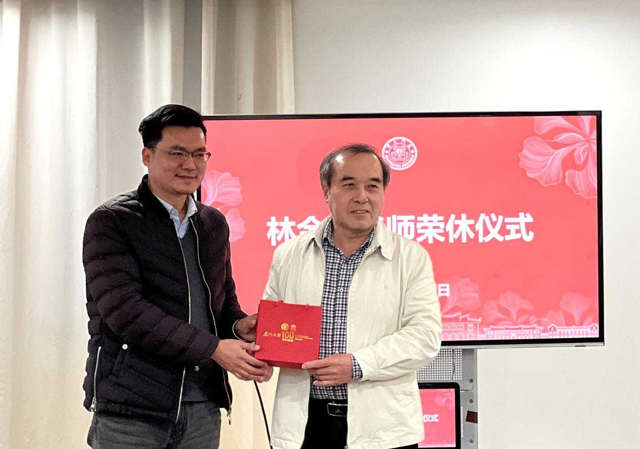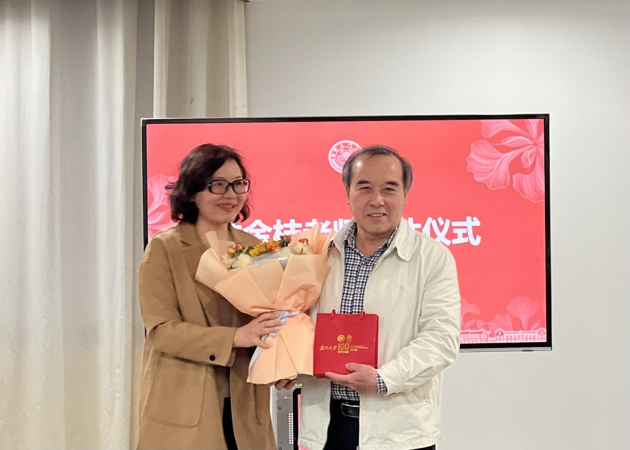 仪式上,人事处副处长柯自聪为林金枝同志颁发荣休证书并赠送纪念品,校纪委副书记陈雪玲献上鲜花。