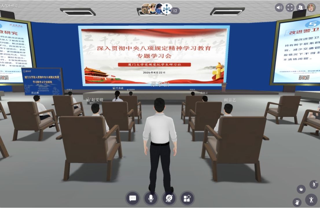 在厦门大学法学院党委的精心指导下,厦门大学党规党纪研习社持续创新学习教育载体,继打造党规党纪学习教育数字展馆与厦门大学廉洁文化作品数字展馆后,再次推出厦门大学深入贯彻中央八项规定精神学习教育元宇宙展馆,构建交互式、情景式、沉浸式、有温度的学习空间,让廉洁教育从“说教式”转向“体验式”,为高校廉洁教育注入新的活力。