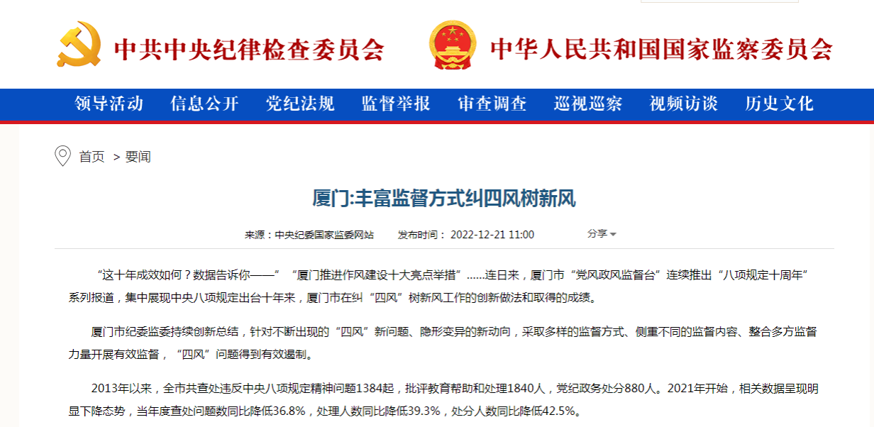日前,为贯彻落实党的二十大对锲而不舍落实中央八项规定精神作出的新部署,厦门市纪委监委出台锲而不舍纠“四风”树新风的工作措施,明确提出要与时俱进、守正创新,持续丰富监督方式提升质效,进一步推动作风建设向纵深发展。