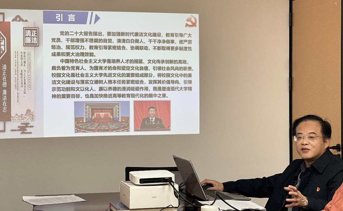 高校是涵养廉洁文化的重要阵地,党的二十大报告提出要加强新时代廉洁文化建设。黄宝秋同志深入介绍了如何以系统观念写好新时代廉洁文化建设“大文章”,传承中华优秀传统文化,弘扬新时代廉洁价值观,用好本土独特教育资源,统筹推进廉洁文化建设,尤其是要加强大学生廉洁价值观教育,提前筑牢大学生廉洁的“铜墙铁壁”。