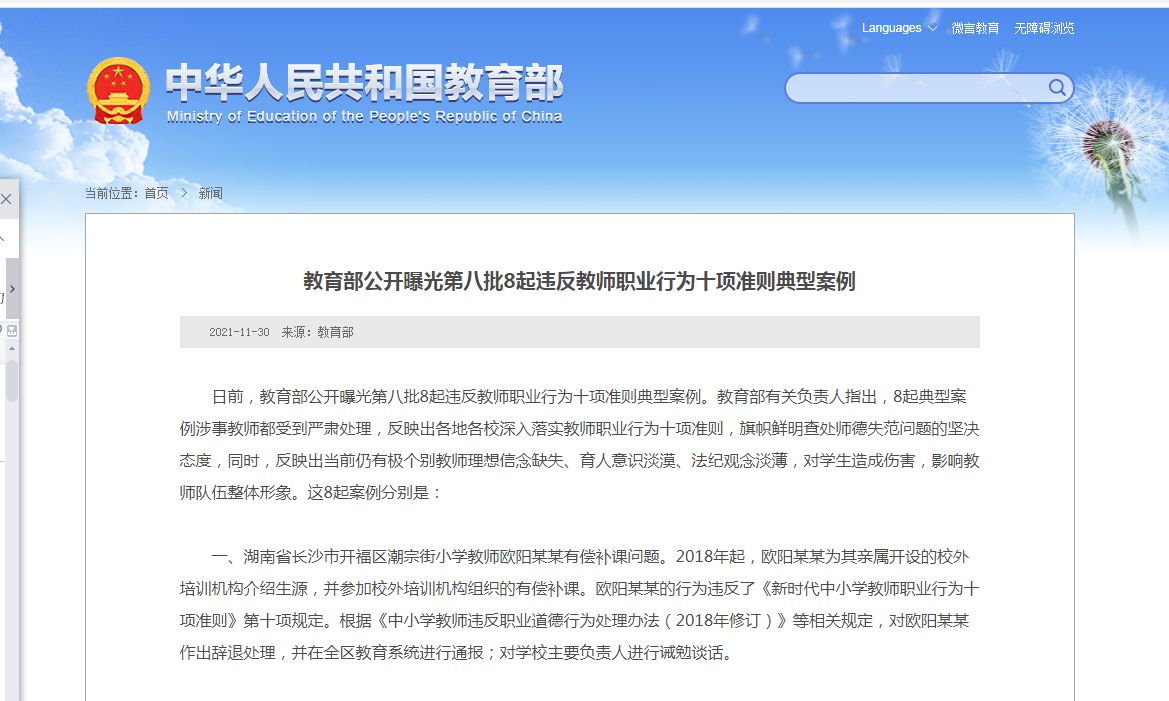 日前,教育部公开曝光第八批8起违反教师职业行为十项准则典型案例。教育部有关负责人指出,8起典型案例涉事教师都受到严肃处理,反映出各地各校深入落实教师职业行为十项准则,旗帜鲜明查处师德失范问题的坚决态度,同时,反映出当前仍有极个别教师理想信念缺失、育人意识淡漠、法纪观念淡薄,对学生造成伤害,影响教师队伍整体形象。这8起案例分别是: