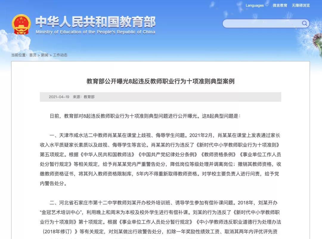 教育部日前对8起违反教师职业行为十项准则典型问题进行公开曝光。这8起典型问题是: