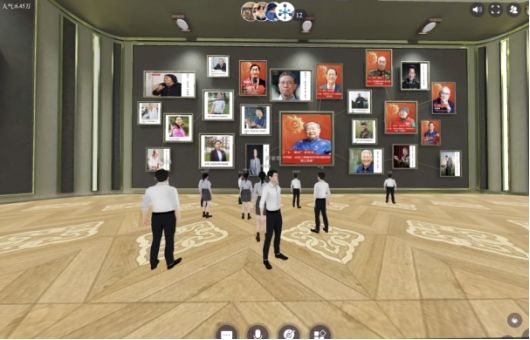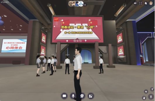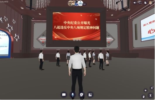 展馆主展厅大屏幕所具有的投屏功能也使得该展馆能够成为一个“线上会场”,参会人员可以操纵虚拟人物在会场落座,此项功能为用户开展学习教育、联学共建搭建了交流平台。